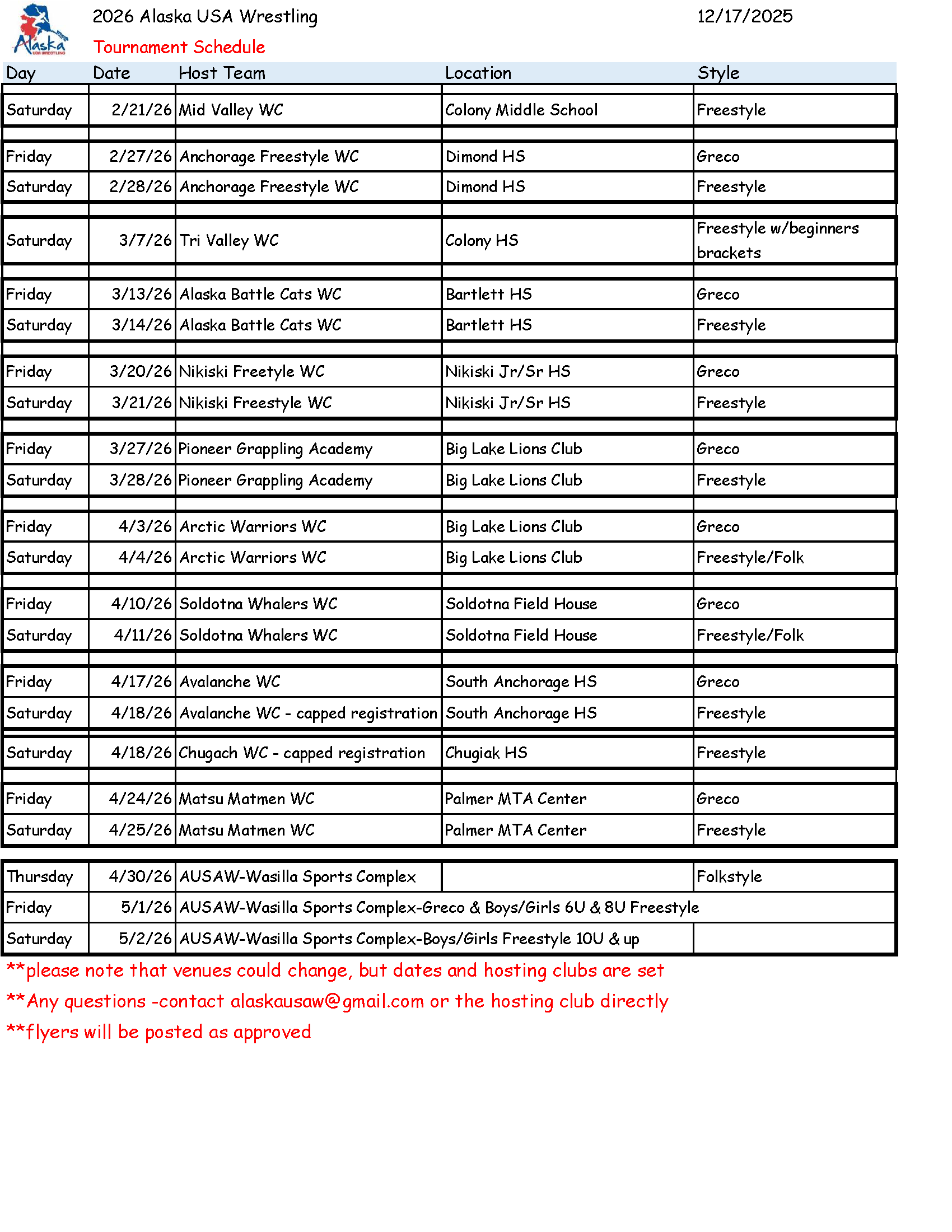 Please see below for the current 2026 AUSAW Tournament Schedule: